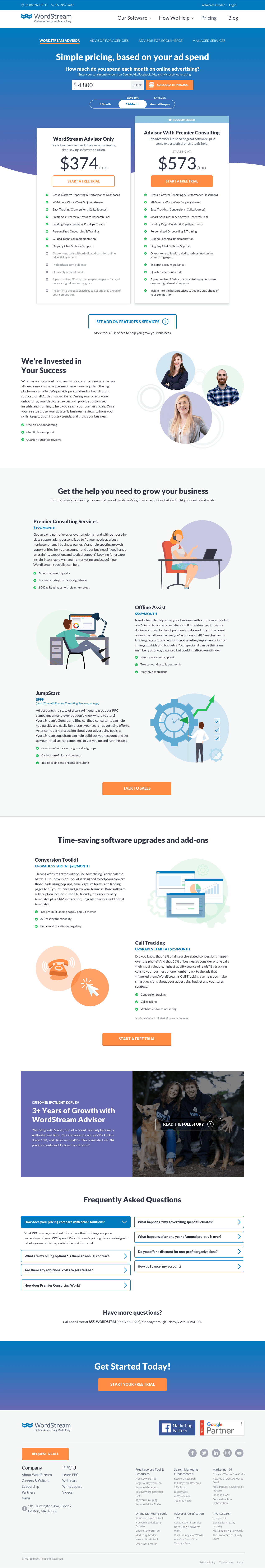 I worked on the redesigns for the WordStream homepage and pricing pages, as well as several other feature pages on the website. These were designed by me and then delivered to our development team to build in Drupal.