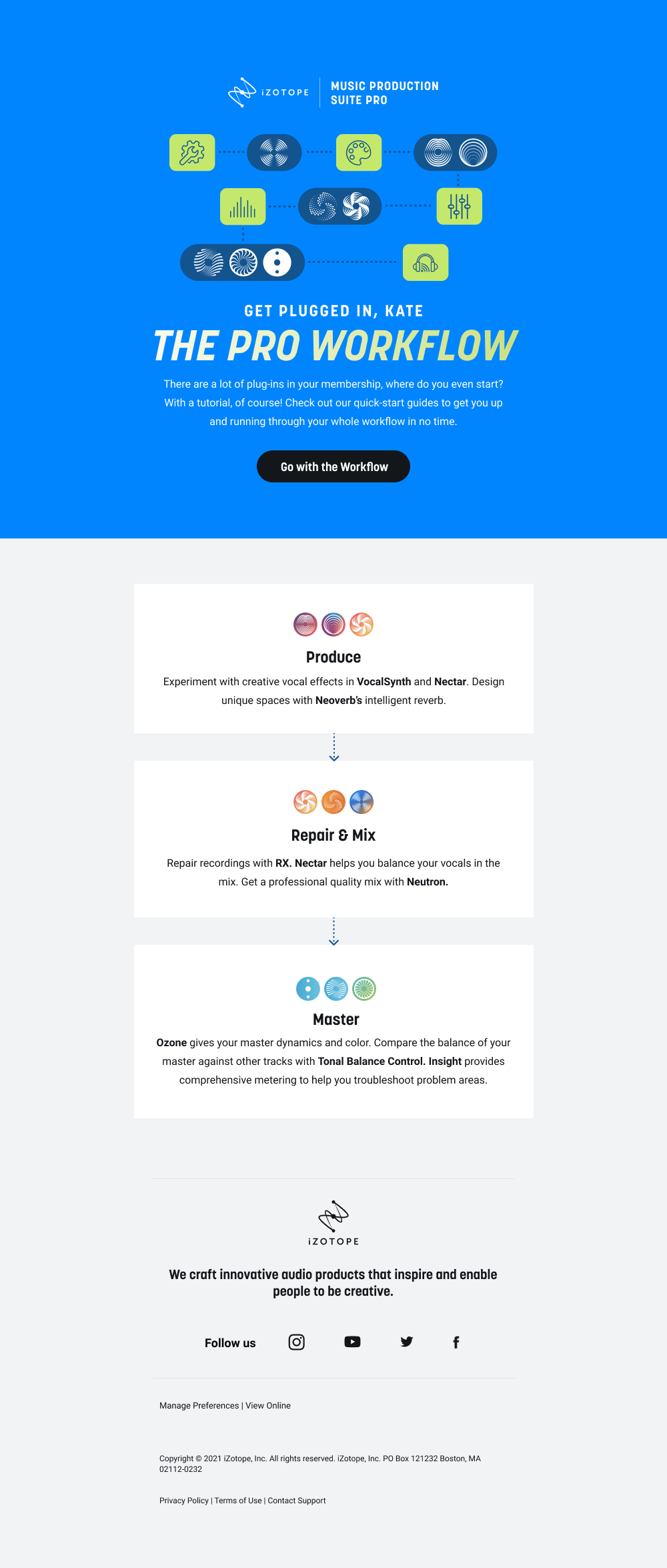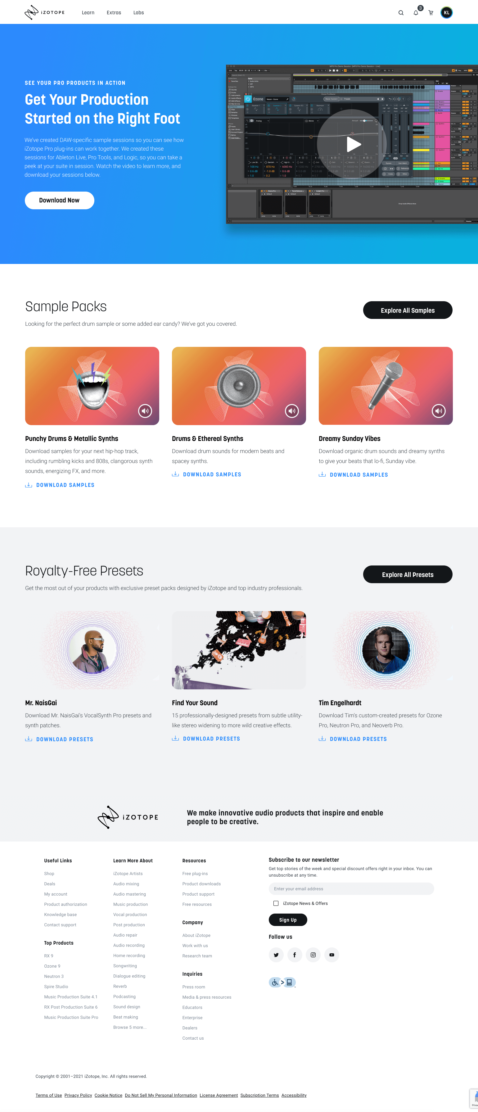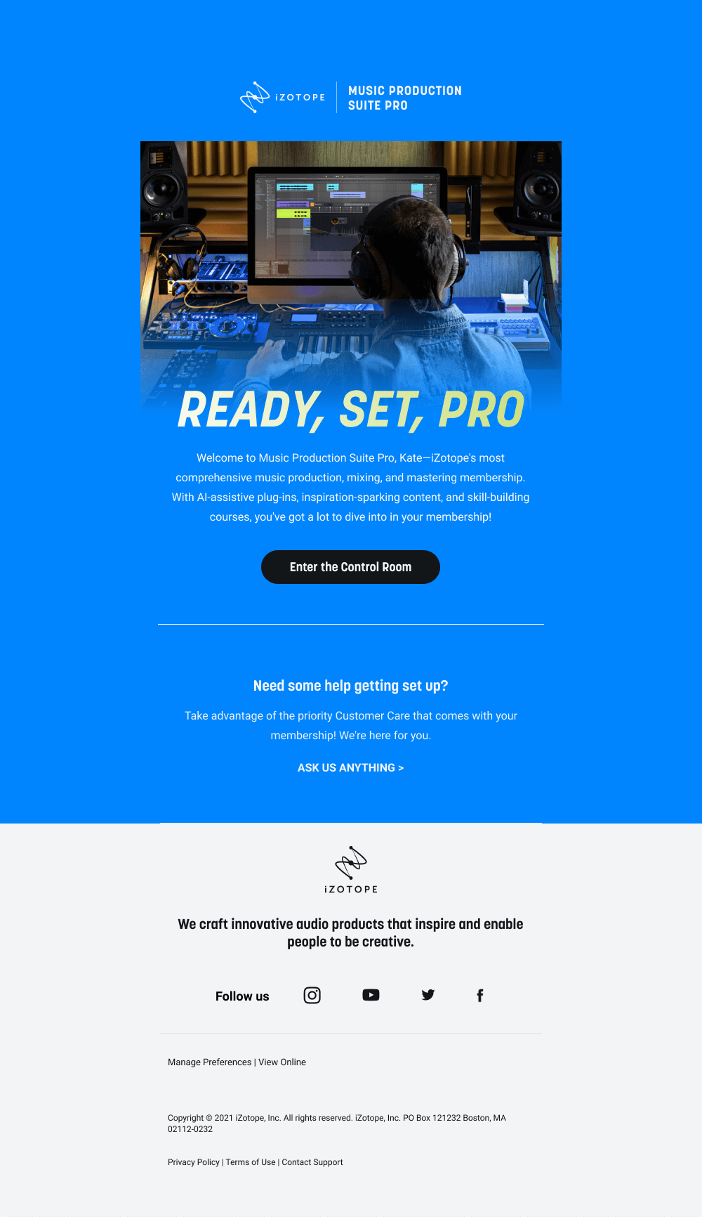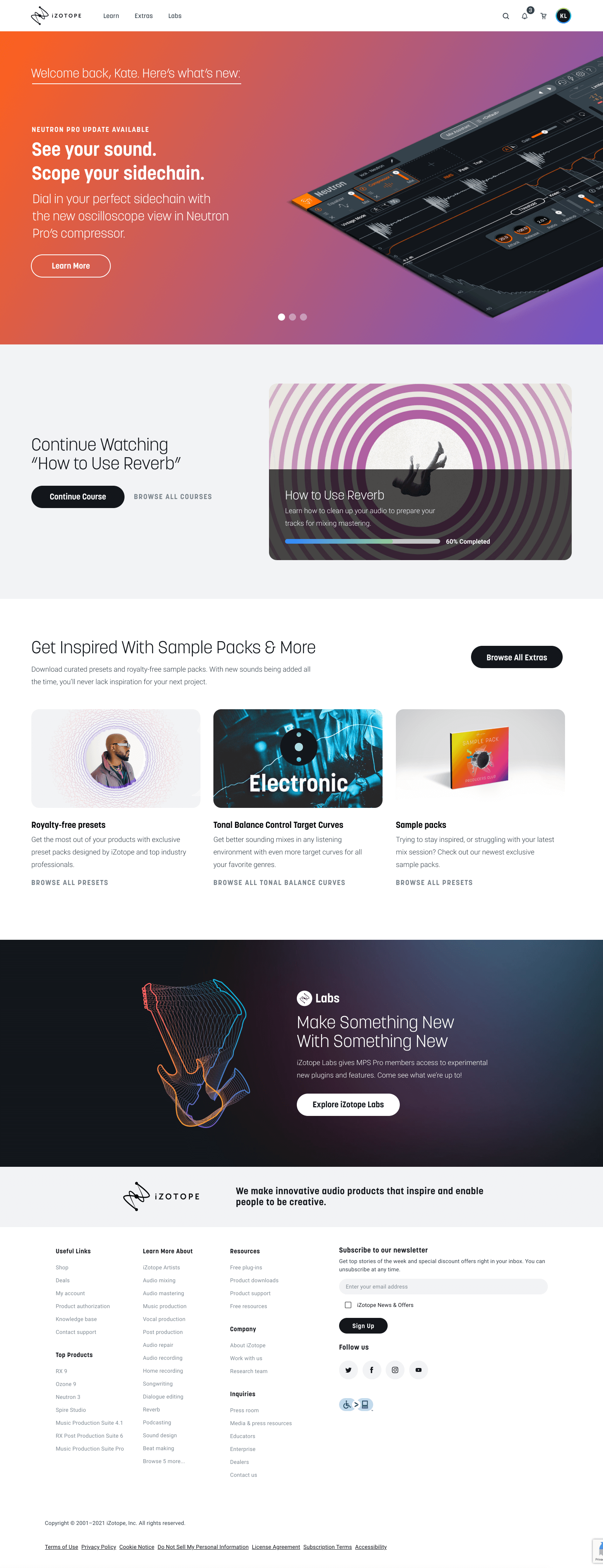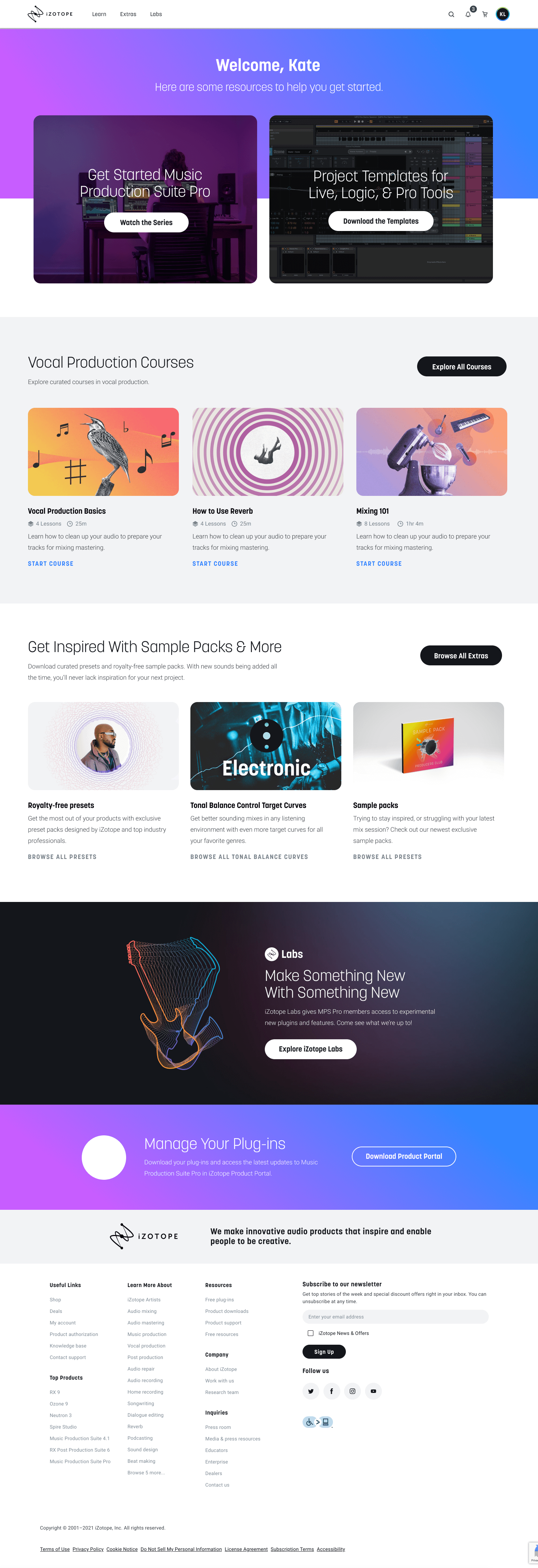 As part of the onboarding & activation team at iZotope, I spent a lot of time working on one their subscription products, Music Production Suite Pro--and more specifically, how to retain and engage musicians and engineers. My work included designing in product messaging popups, a hub on the website for subscribers, as well as all of the usual promotional assets.